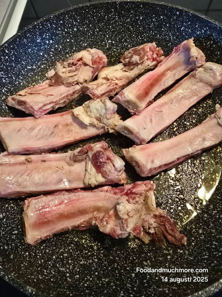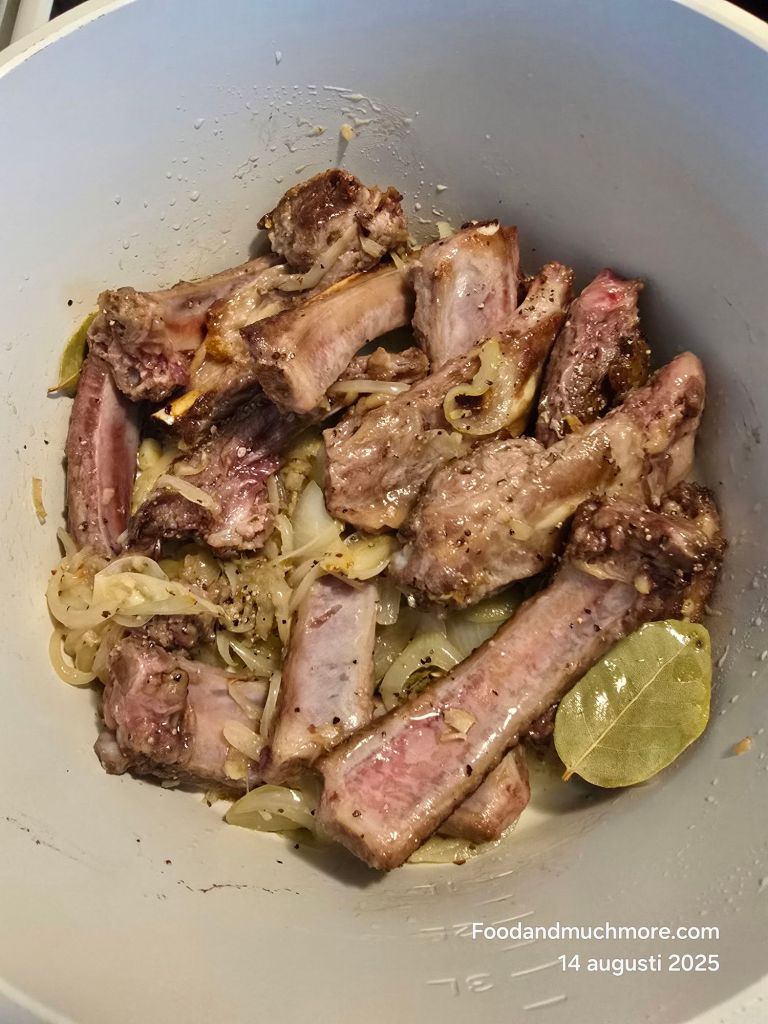 Hetta upp olivolja i en stor gryta. Bryn ribsen runt om tills de får en gyllene yta.