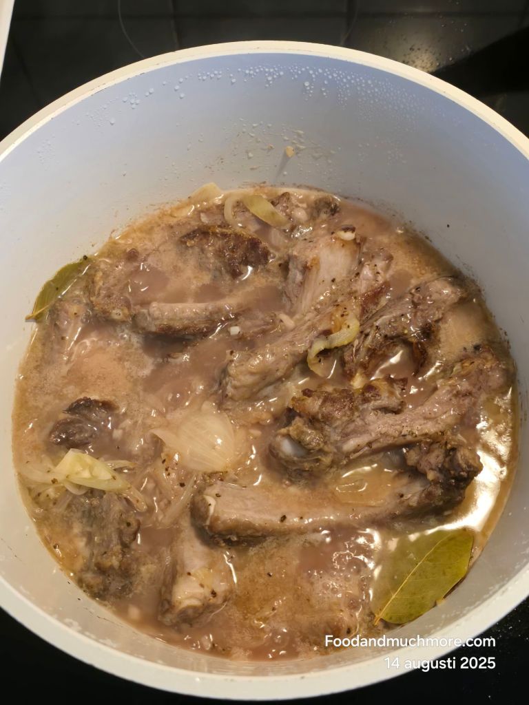 Sänk värmen, lägg på lock och låt sjuda på låg värme i cirka 1,5 timme, eller tills köttet lossnar från benen.