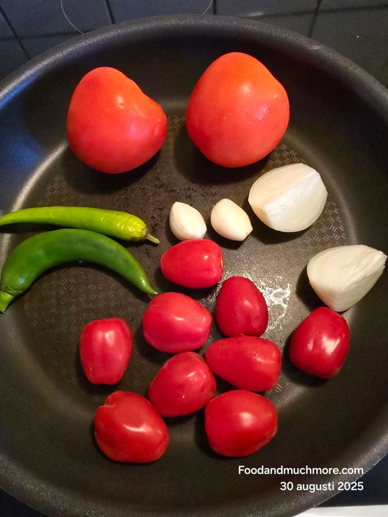 Rosta tomater, chili, lök och vitlök i en torr panna tills de fått sotiga fläckar.