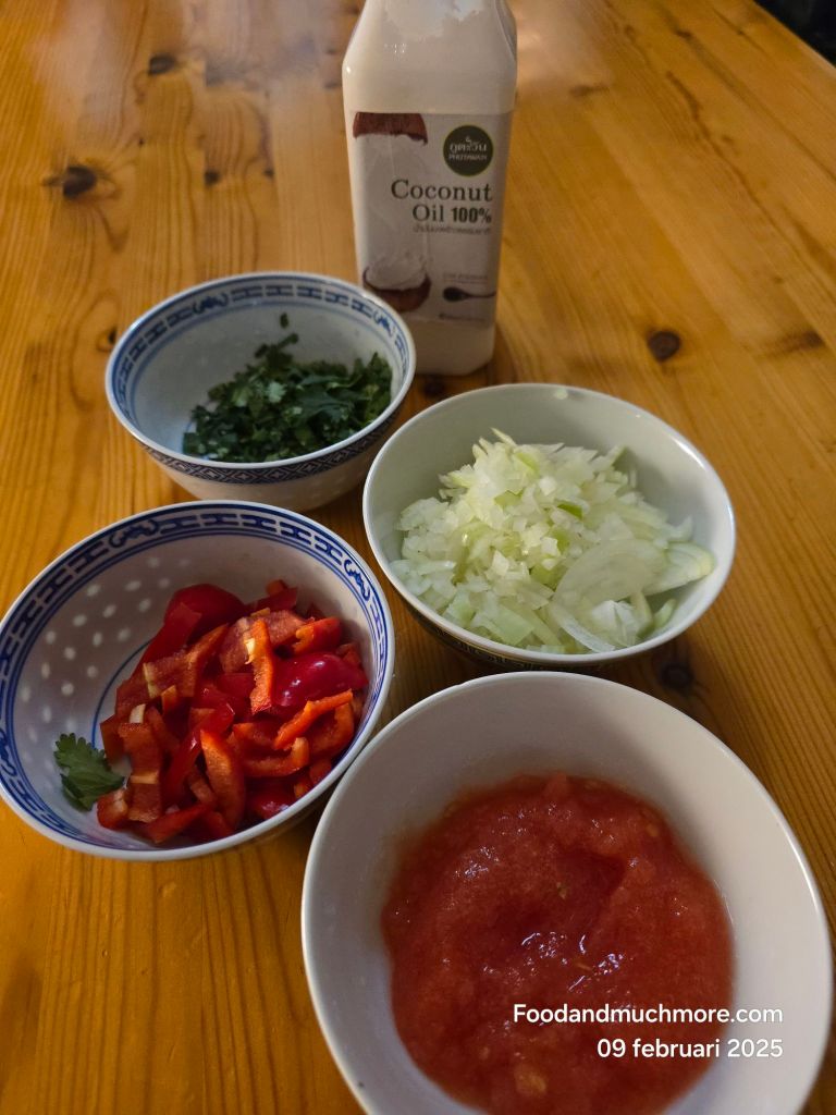 2 Hetta upp olja i en stekpanna. Jag anväde kokosolja. Lägg i lök och vitlök i stekpannan och stek på låg värme tills loken mjuknat. Tillaätt paprikan, koriandern och tomaterna. Smaksätt med salt och peppar. Blanda allt väl. Låt koka i 5 minuter eller tills allt har blivit varmt.