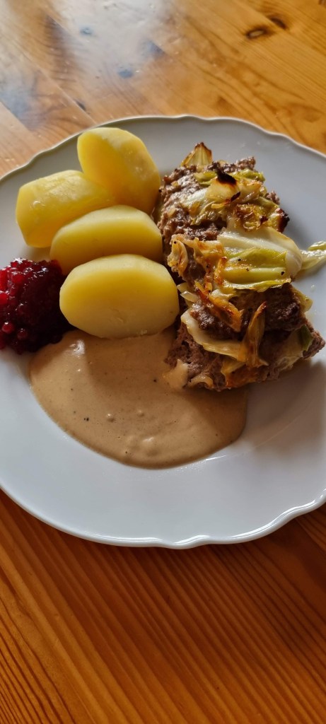 Cabbage pudding is a traditional Swedish dish consisting of finely chopped white cabbage and minced meat that is mixed and then gratinated in the oven. This dish is known for its simple preparation and its rich, homey flavors. Cabbage pudding is usually served with brown sauce/cream sauce and boiled potatoes and is a popular Swedish home cooking.
