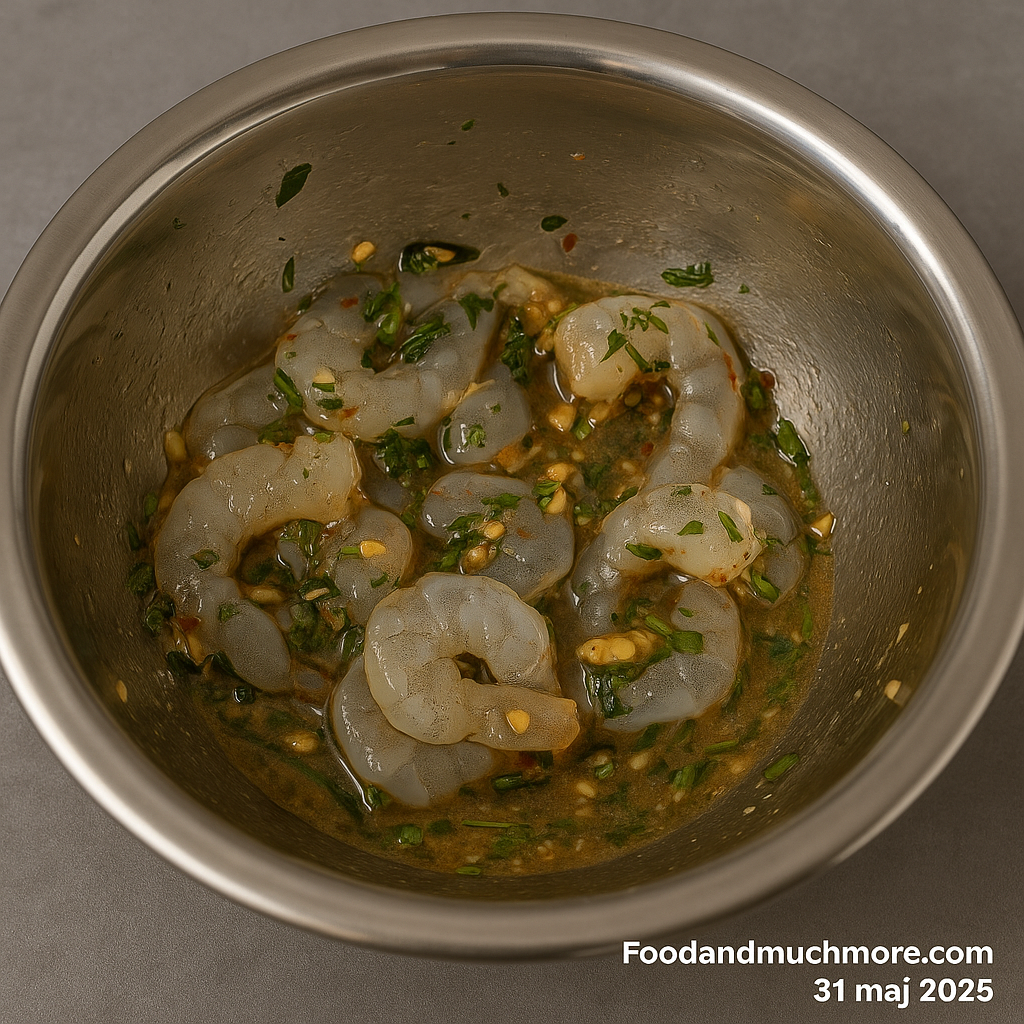 Blanda alla ingredienser till marinaden. LÀgg i rÀkorna och lÄt dra i kyl minst 30 minuter (ej lÀngre Àn 1 timme, annars blir de sega).