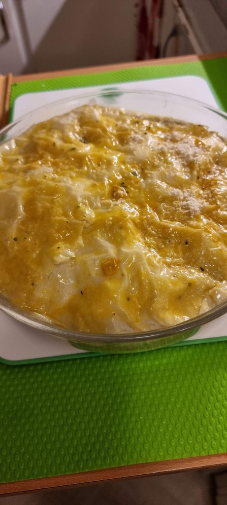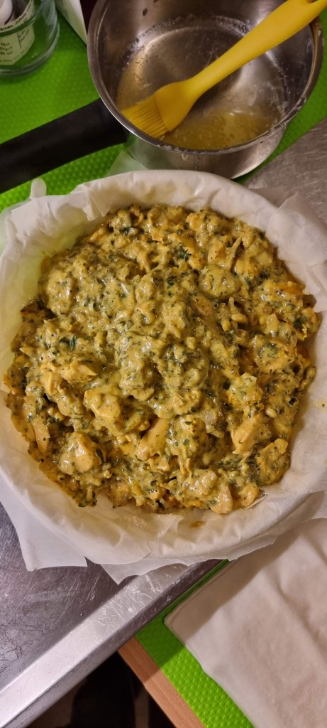 - Mix the chicken meat and the onion filling with the egg sauce. Pour everything into the pie shell.