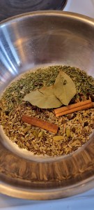 1, Dry roasted bay leaves, cinnamon stick, cardamom, cloves, star anise, black sesame. coriander seeds, fennel seeds, cumin seeds and black pepper until it starts to smell lovely in the kitchen. Grind the spices in a spice grinder or coffee grinder to a fine powder.