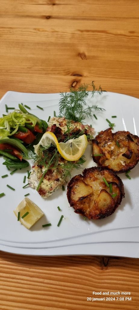 Ingredienser 4 port Gör så här 1. Sätt ugnen på 220 grader 2. Torka av fisken. Lägg i en ugnform