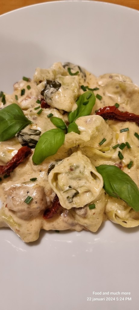 Tortellini med kyckling i krämig sås är en ljuvlig pastarätt som kombinerar färska tortellini-fyllda pasta, allt badat i en härligt