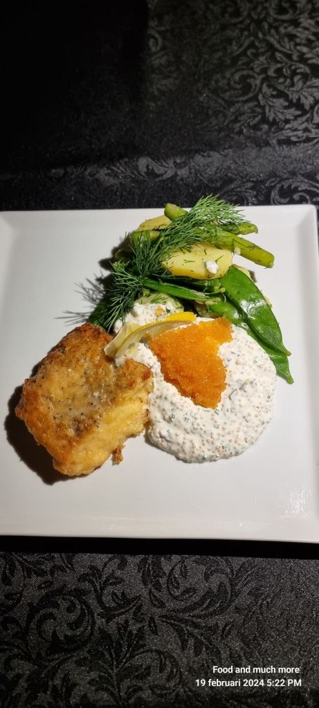 Du behöver ingen ugn, laxen kan också stekas färdigt i stekpannan på svag värme. Ingredienser 4 personer Potatissallad: Romsås: Garnering: