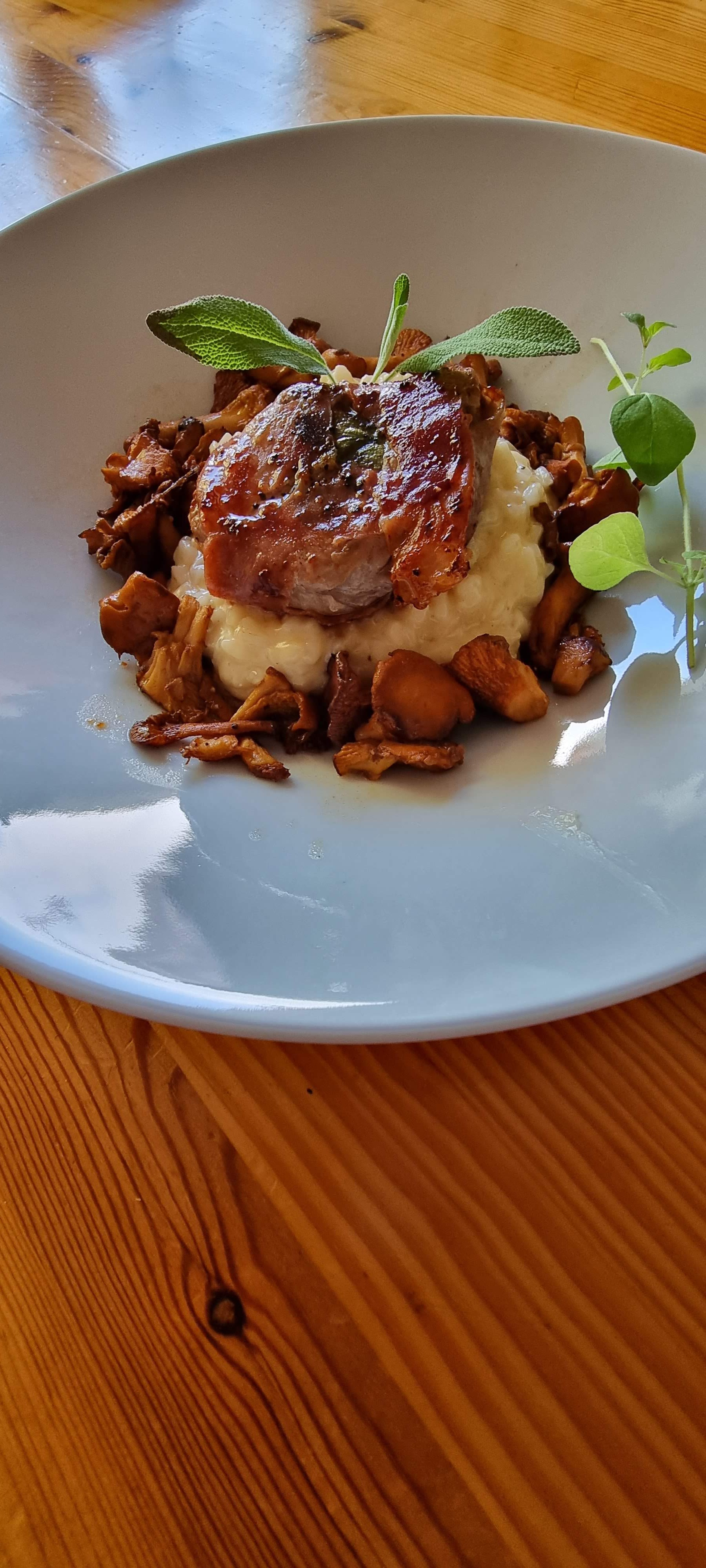 En Saltimbocca av vildsvins kotlett inlindat i latdo och parmaskinka på en bädd av en krämig risotto