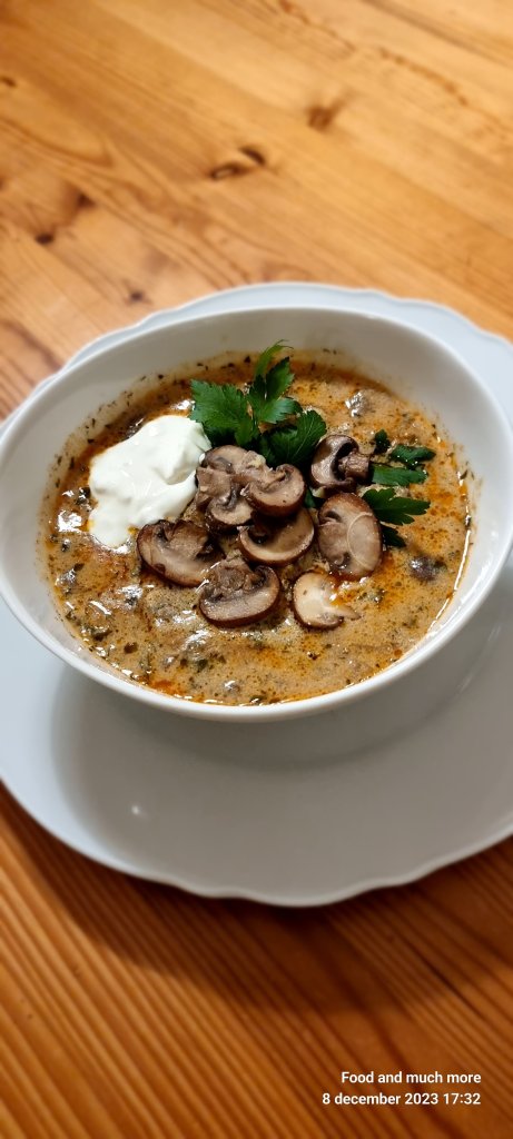 5. Servera i skålar och granera med stekt svamp skivor, gräddfil och persilja. Ät ett gott bröd till.